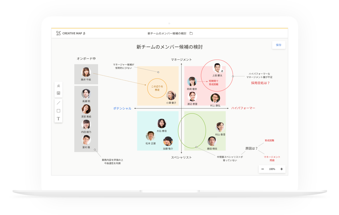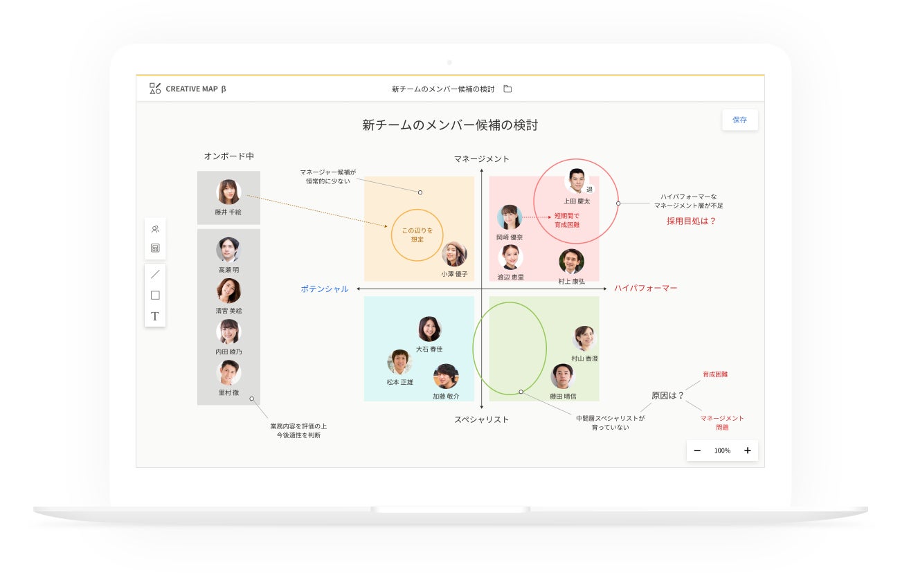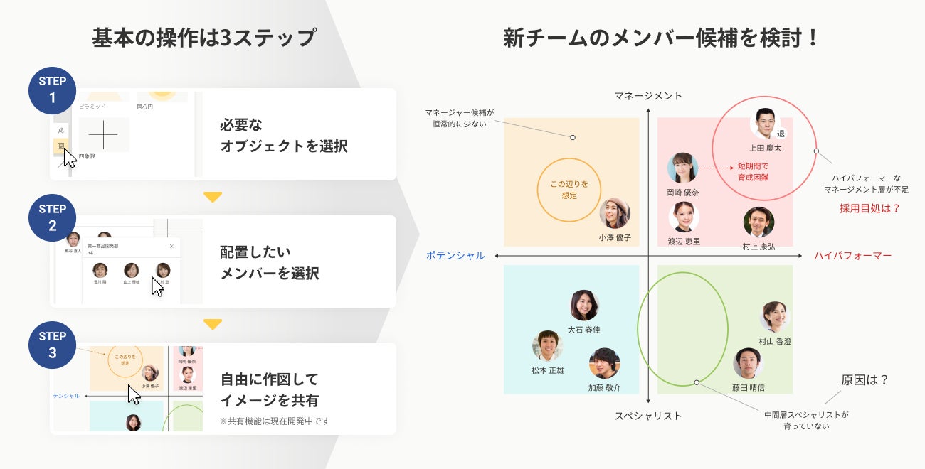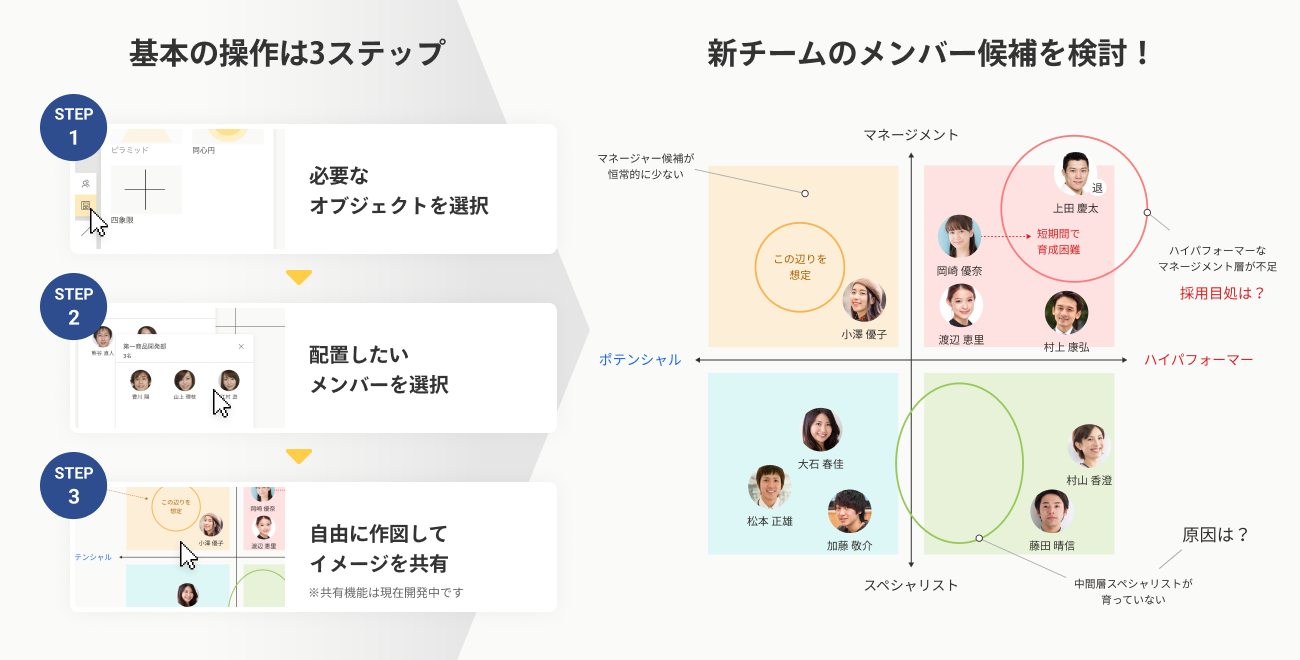 本機能は、チームビルディングを誰でもより効果的に行えるように開発された「イメージシェアツール」です。タレントマネジメントシステム「カオナビ」のデータベースに蓄積された人材情報を、様々なオブジェクトで描いたキャンバスに配置することでチームビルディングにおける課題を共有することができます。また、オンラインミーティングの際に活用すれば、議論の中で交わされたアイデアを自由にメモとして残せるため、伝わりにくい微妙なニュアンスも共有することができ、従来オフラインで行われていたような質の高い議論を可能にします。
