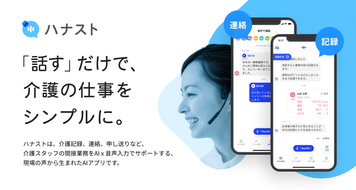 「CareWiz ハナスト」は、「介護記録に”話す”ことを活かせないか?」という介護現場の声をもとに開発された介護記録AIアプリです。介護サービス事業所・施設のご利用者名と介助の内容を声に出して発話するだけで、AIが介護記録に関連する言葉だけを読み取り記録化します。