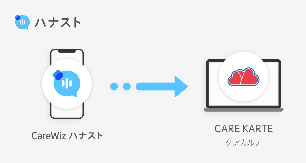 また、ケアコネクトジャパンが提供する、全国1万2000の介護サービス事業所・施設や障がい福祉サービス事業所で導入されている介護記録・請求ソフト「CAREKARTE(ケアカルテ)」との連携を実現。「CareWiz ハナスト」を使って声で記録をしたあとは、簡単に「CAREKARTE」にデータ連携でき、介護記録・情報共有・保険請求までを一気通貫で行えます。