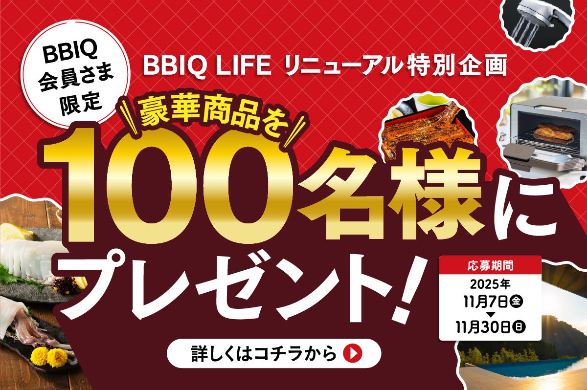 リニューアル前から毎月ご好評いただいているBBIQ会員さま限定の「プレゼント企画」が今月号はリニューアル記念として、豪華賞品を抽選で合計100名様にプレゼントする拡大版でお届け。