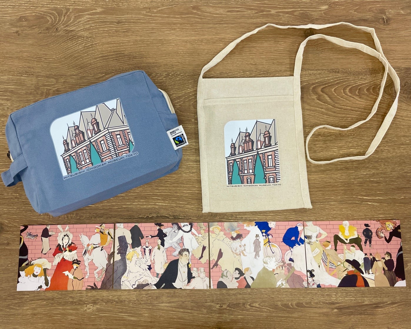 ブルーグレーのマチ付きポーチは、トラベルグッズやゴルフ用品、推し活グッズなどさまざまな用途にご利用いただけます。サコッシュは外側と内側両方にポケットがあり、スマートフォンがすっぽり入るサイズです。ポストカードは、兼ねてよりご好評いただいている服部一成氏による休館中の仮囲いのデザインで、4種類の絵柄をつなげるとループする仕掛けになっています!