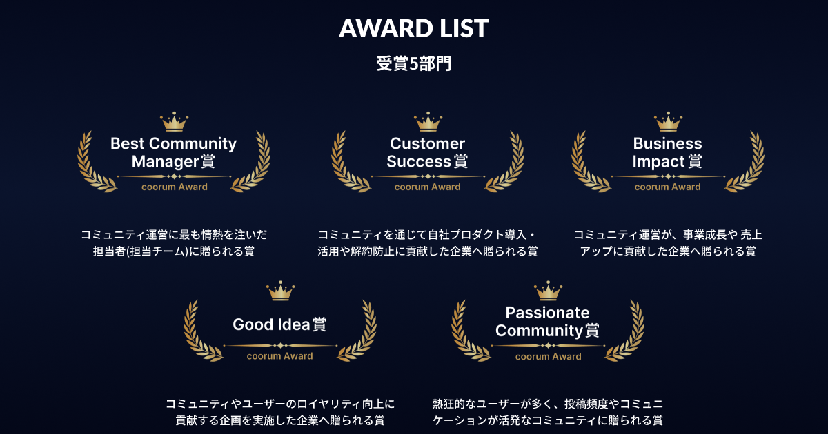 「coorum(コーラム)」をご利用いただいている導入企業への感謝と、コミュニティを通じてお客様との継続的なコミュニケーションやロイヤリティ向上などへの日々の取り組みを讃え、広く発信するために2023年より運営しております。素晴らしい実績ならびに積極的な取り組みを行った企業の中から、「Best Community Manager賞」「Customer Success賞」「Business Impact賞」「Good Idea賞」「Passionate Community賞」からなる全5部門が選出されるアワードです。