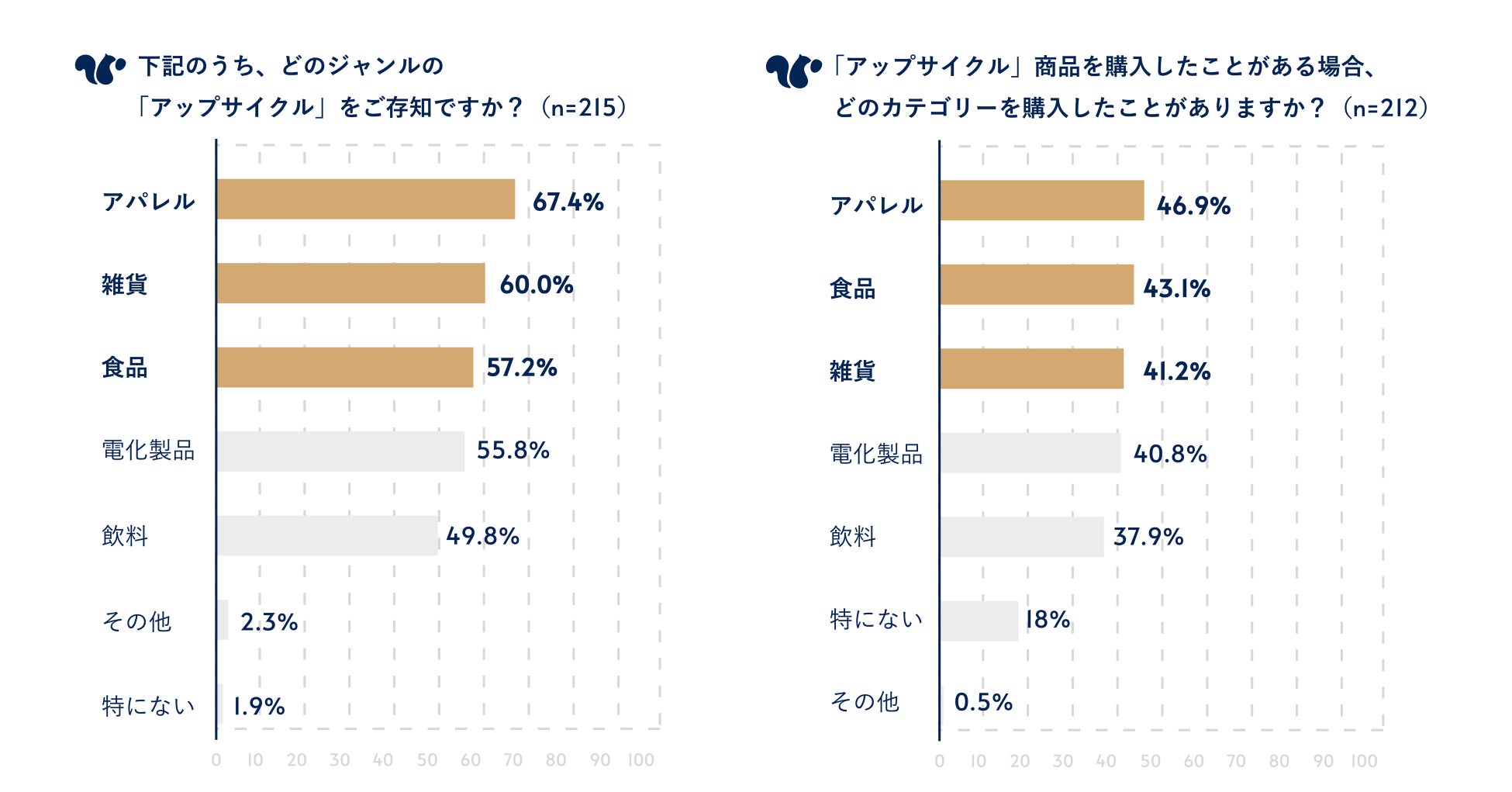 ジャンル別では、アパレル、雑貨、食品についてのアップサイクルが認知されており、購入経験ではアパレル、食品、雑貨の順に多い