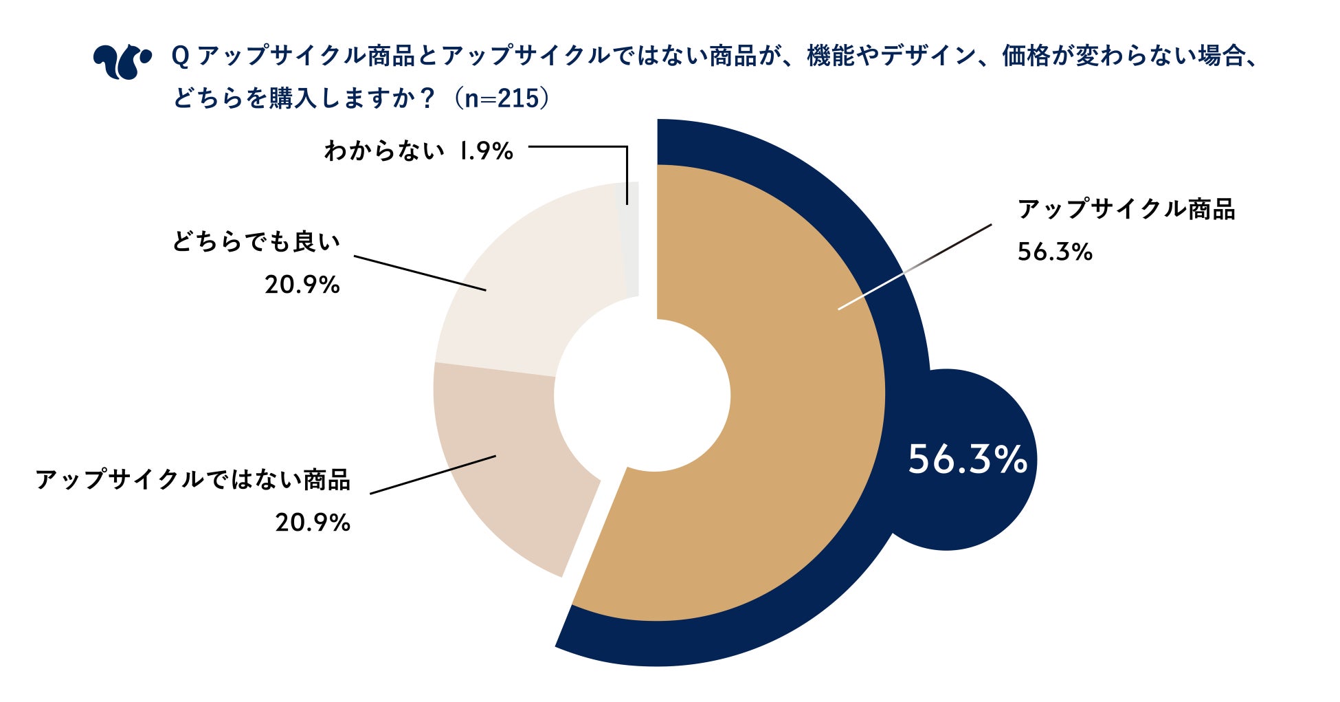 価格や機能が変わらなければアップサイクル商品を買うと人が56%と、非アップサイクル商品を選ぶ人(21%)よりも多い