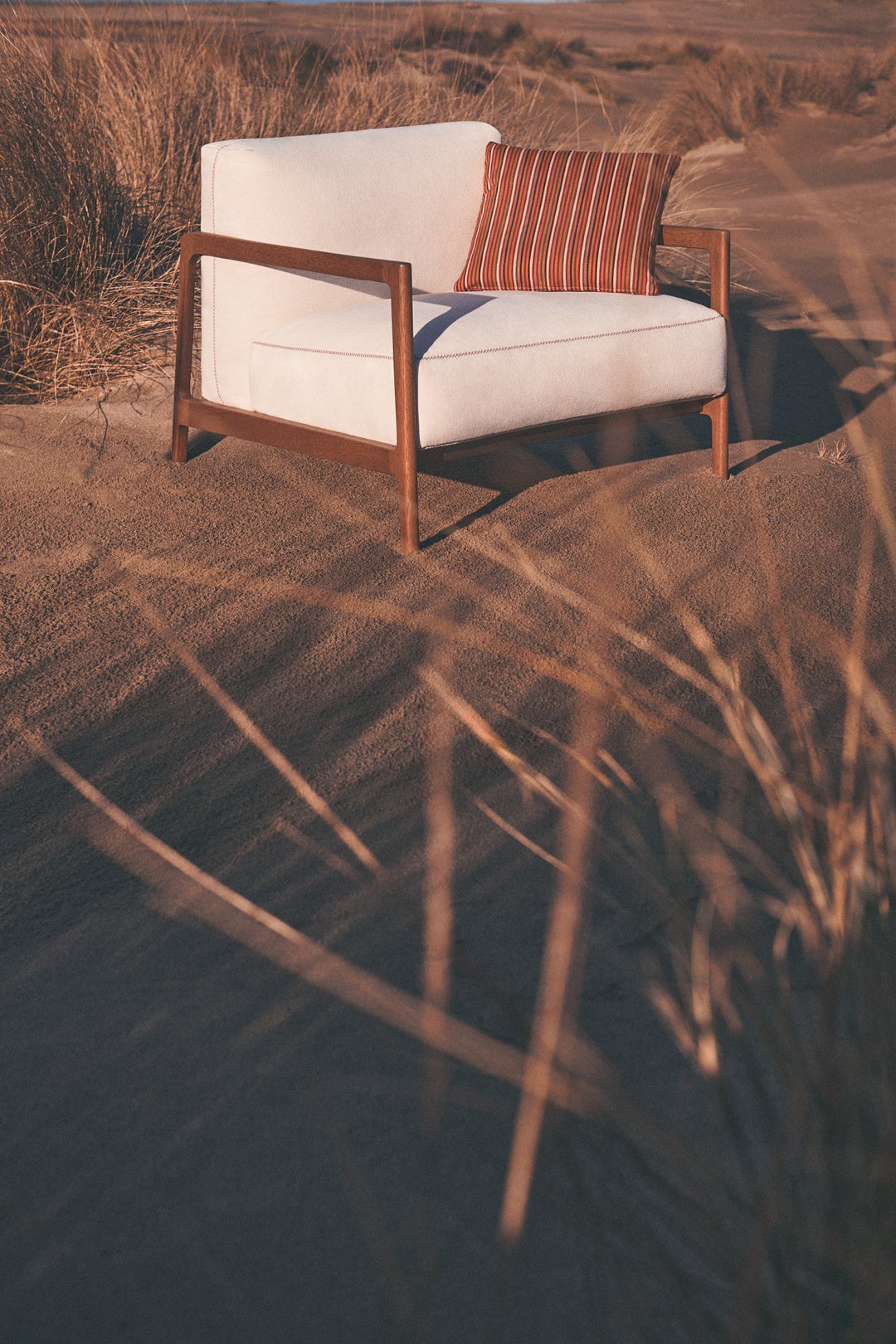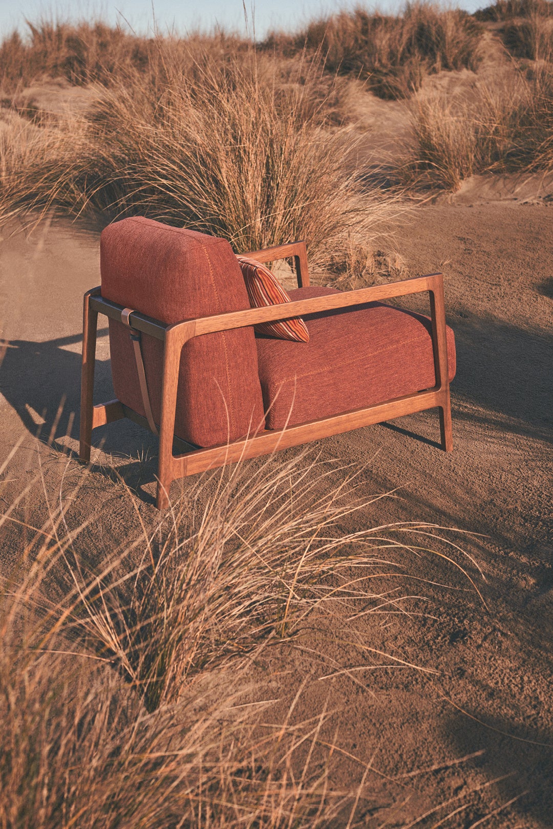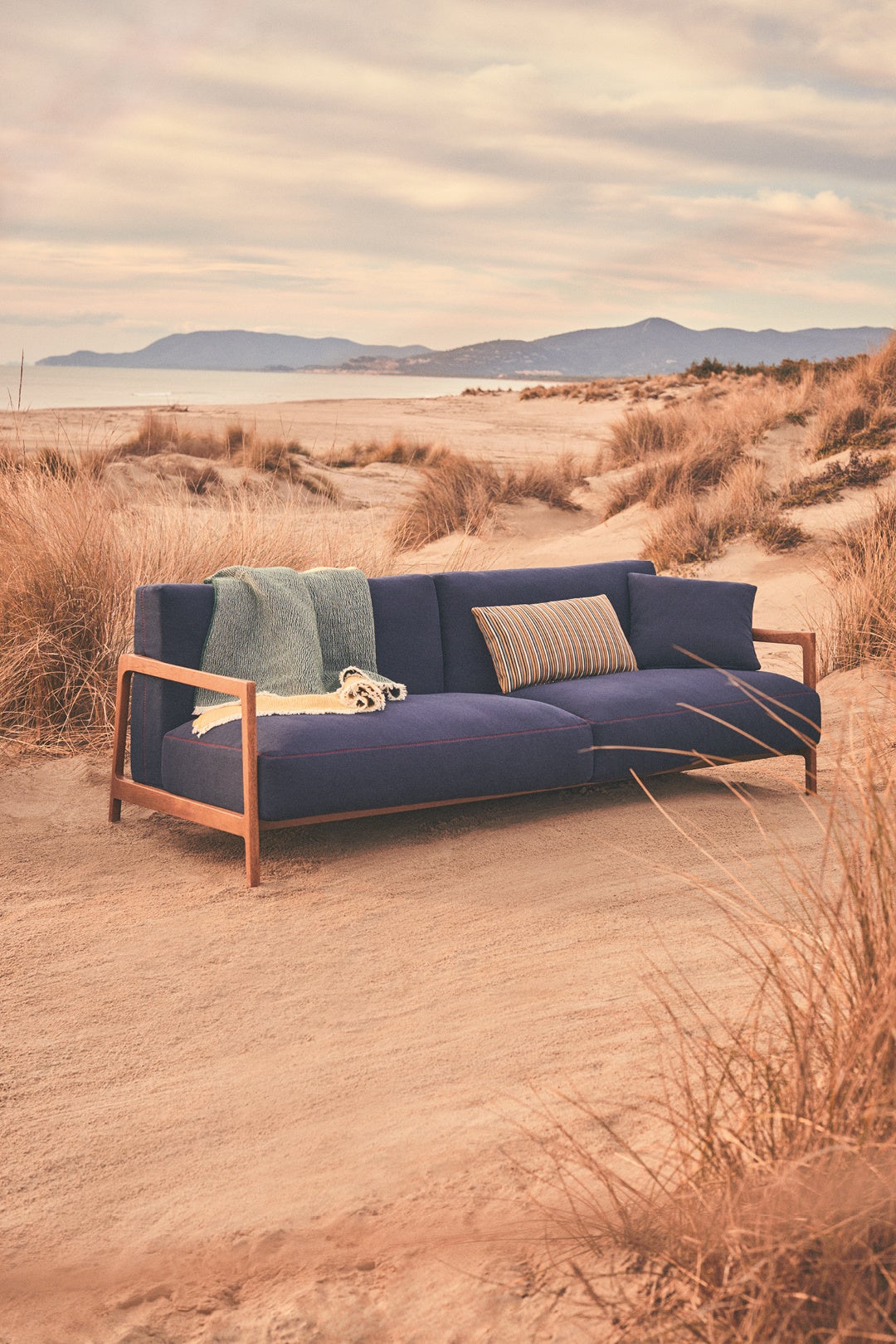コレクションは、ソファ、プーフ、アームチェア、コーヒーテーブル、リビングルーム用のレザーアクセサリーなど、幅広いアイテムが揃っています。また、現代の住まいのために、さまざまな形に組み立てて配置し、親しみやすく、和やかな雰囲気を演出できるモジュラーソファも加わりました。コレクションは屋外家具(ガーデンファニチャー)の世界にも広がり、屋外用ファブリックやイロコ材のフレームなど、特徴的なシルエットと高性能な機能を受け継ぎ、オープンエアリビングへの関心の高まりにエレガントに応えるものとなっています。