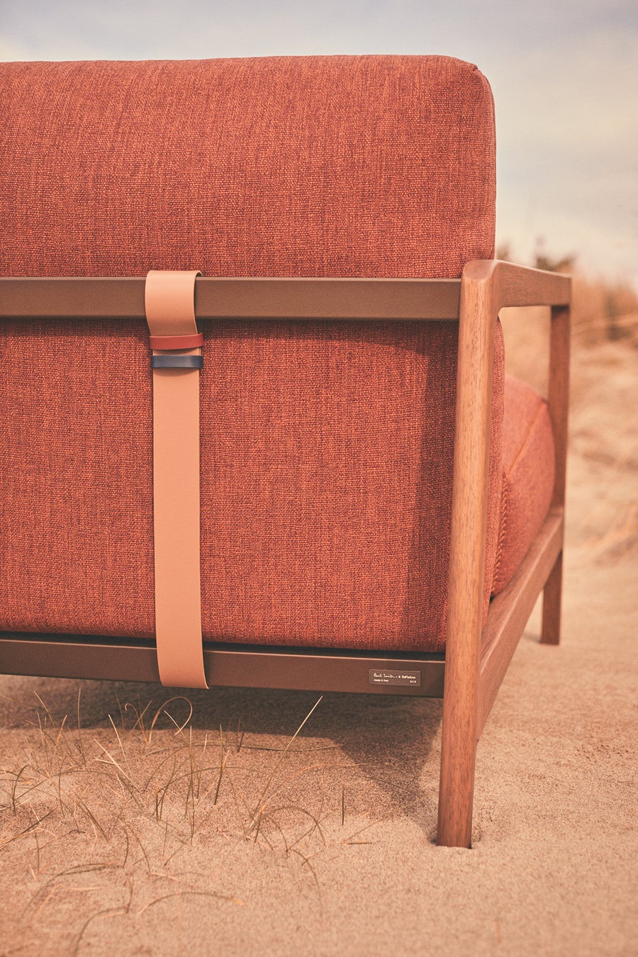ソファの背面には、ポール・スミスのシグネチャーである“ストライプ“を連想させる小さなカラーストラップが配されています。さらに、接合部分は、デザイナーが愛してやまない日本の伝統的な箪笥へのオマージュです。