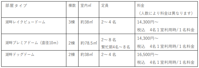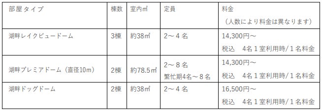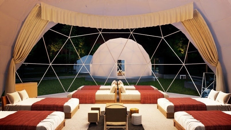 滞在に応じて選べる部屋タイプを備え、グランピングに適したドームテントは年中快適。
