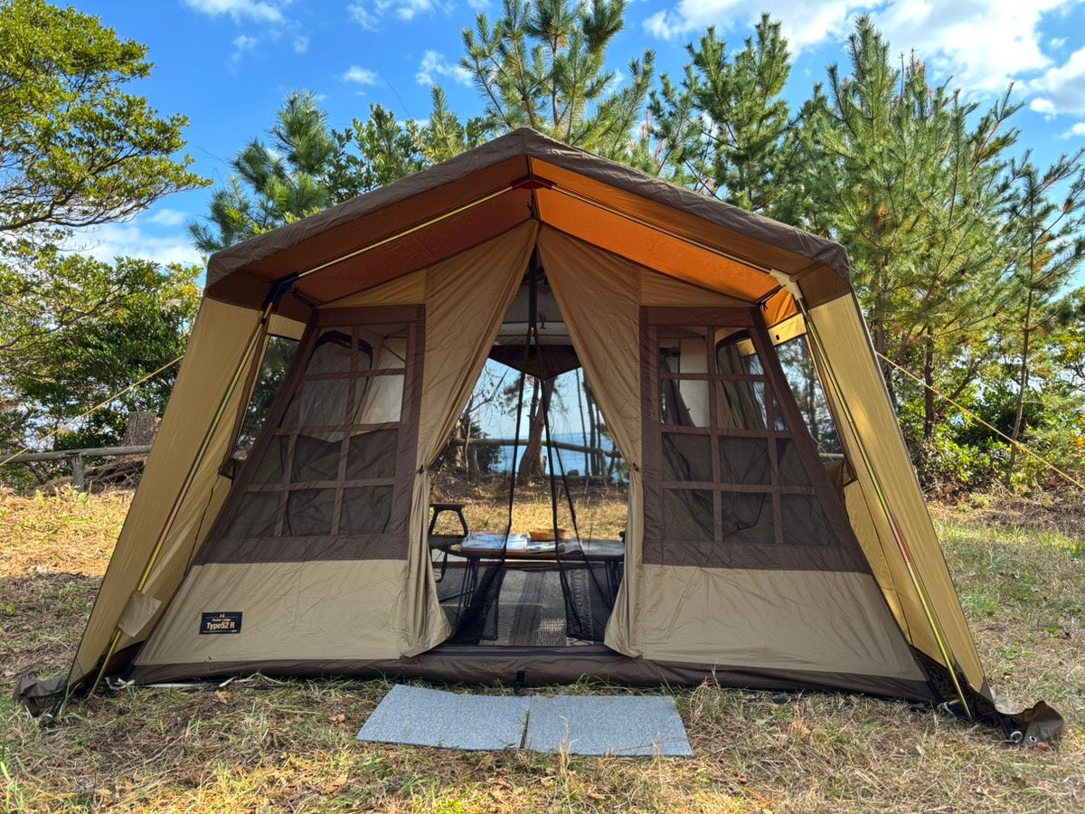 展示されている神割崎キャンプ場だと目の前に広がる海をテントの中から見ることができるため、ロケーションとの相性もすごく良いテントです。