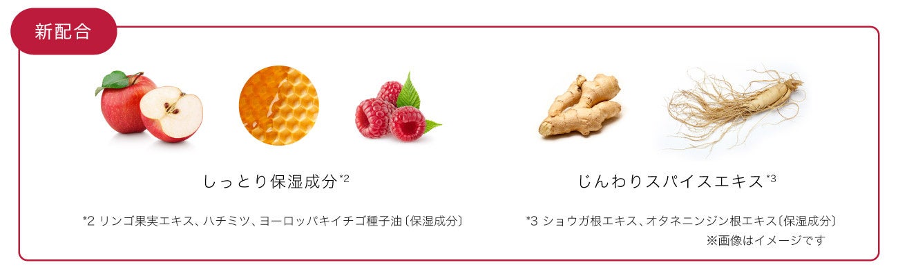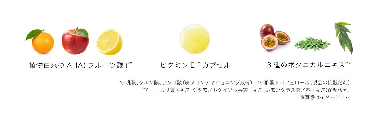 植物由来のAHA(フルーツ酸)*5でやさしく角質ケア。ビタミンE*6カプセルや、美肌へ導く3種のボタニカルエキス*7に加え、しっとり保湿成分*2とじんわりスパイスエキス*3を新配合。
