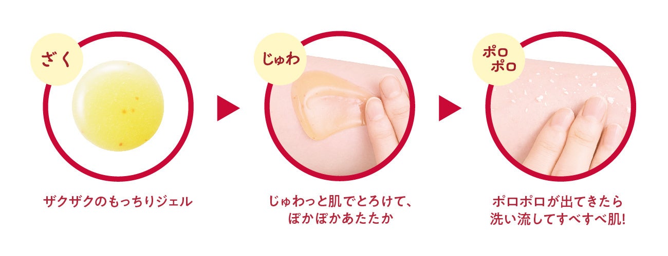 ザクザクしたシュガー*4スクラブinジェルが肌の上でじゅわっととろけて、ぽかぽかあたたか。マッサージするとポロポロが古い角質をからめとります。