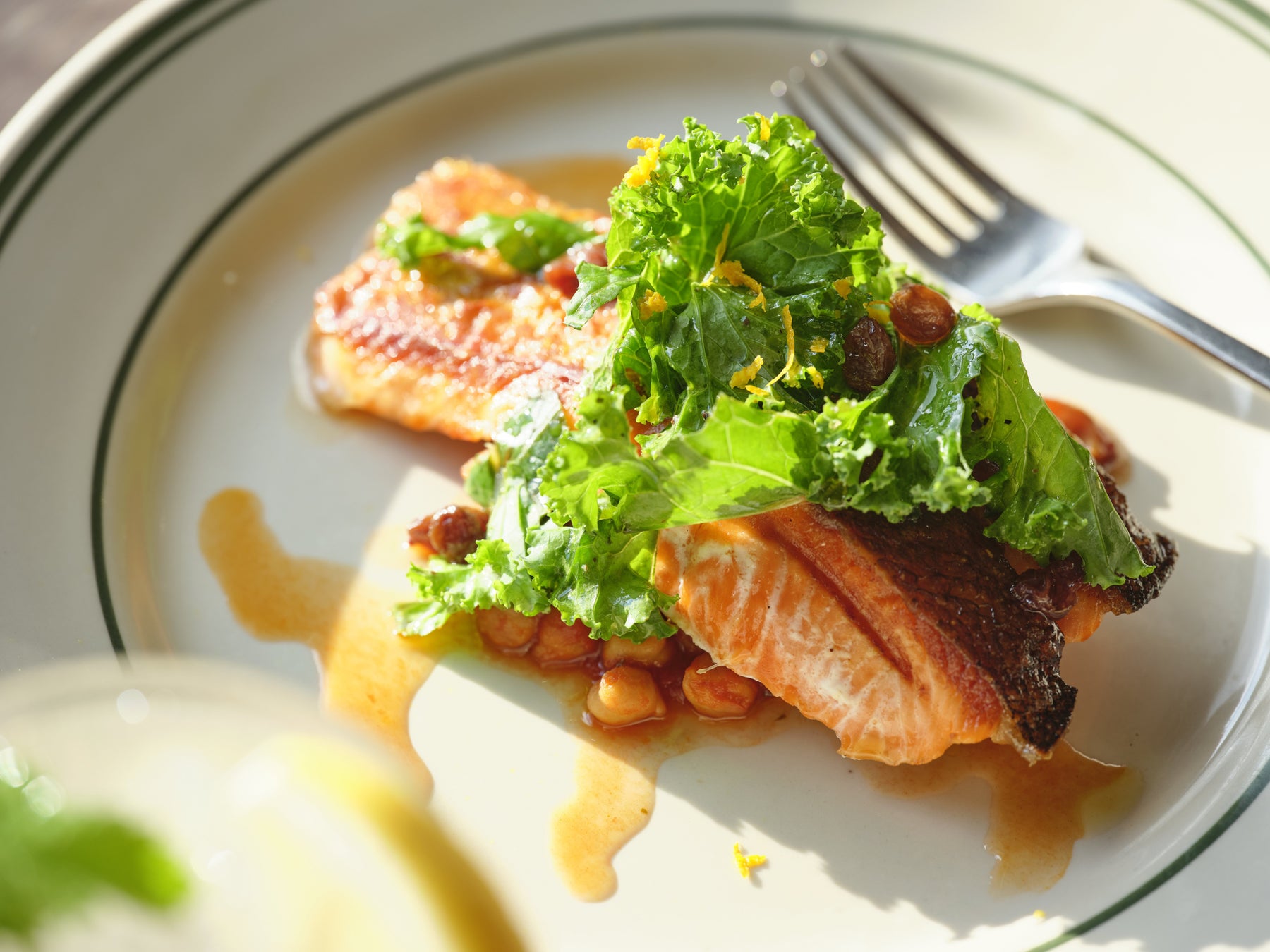 香ばしく焼き上げた脂の乗ったサーモンに、ひよこ豆をベースにした甘みのあるソースとご一緒に。