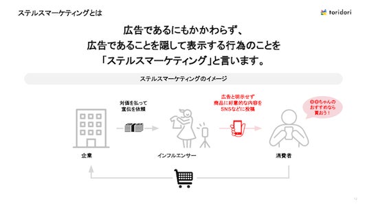 昨今のSNSの急速な発展に伴い、広告であるにもかかわらず、広告であることを隠してSNS上でPR投稿を行い、消費者に誤認を与える「ステルスマーケティング」が増加し、社会問題化しています。