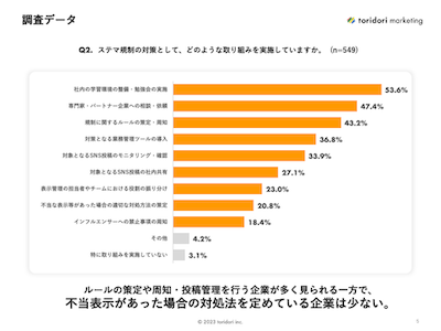 「ステマ規制の対策として、どのような取り組みを実施していますか。」という質問には、「社内の学習環境の整備/勉強会の実施(53.6%)」や「専門家やパートナー企業への相談/依頼(47.4%)」、「規制に関するルールの策定/周知(43.2%)」など、社内での対策に関する回答が多く集まりました。
