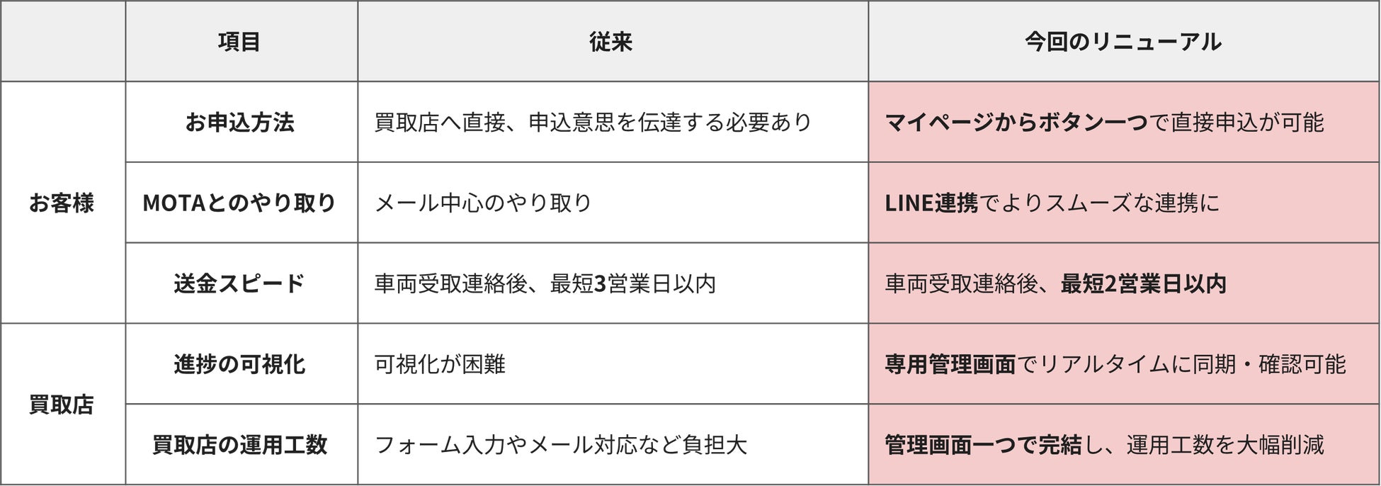中古車買取市場において、高額資産である車両の引き渡しと代金の支払いに時間差が生じる構造は、長年の課題となっています。実際に市場では、「車両を引き渡したにもかかわらず入金されない」「買取店の倒産により買取代金が支払われない」といった事態が懸念されており、お客様からの不安が高まっておりました。MOTAでは2025年6月より「あんしん決済」を提供してきましたが、お客様による申し込みの複雑さ、買取店側の運用工数の増大や、進捗管理が困難であるといった課題を抱えており、この心理的・物理的な障壁をテクノロジーで解決するため、取引プロセスの全面的なシステム化に踏み切りました。