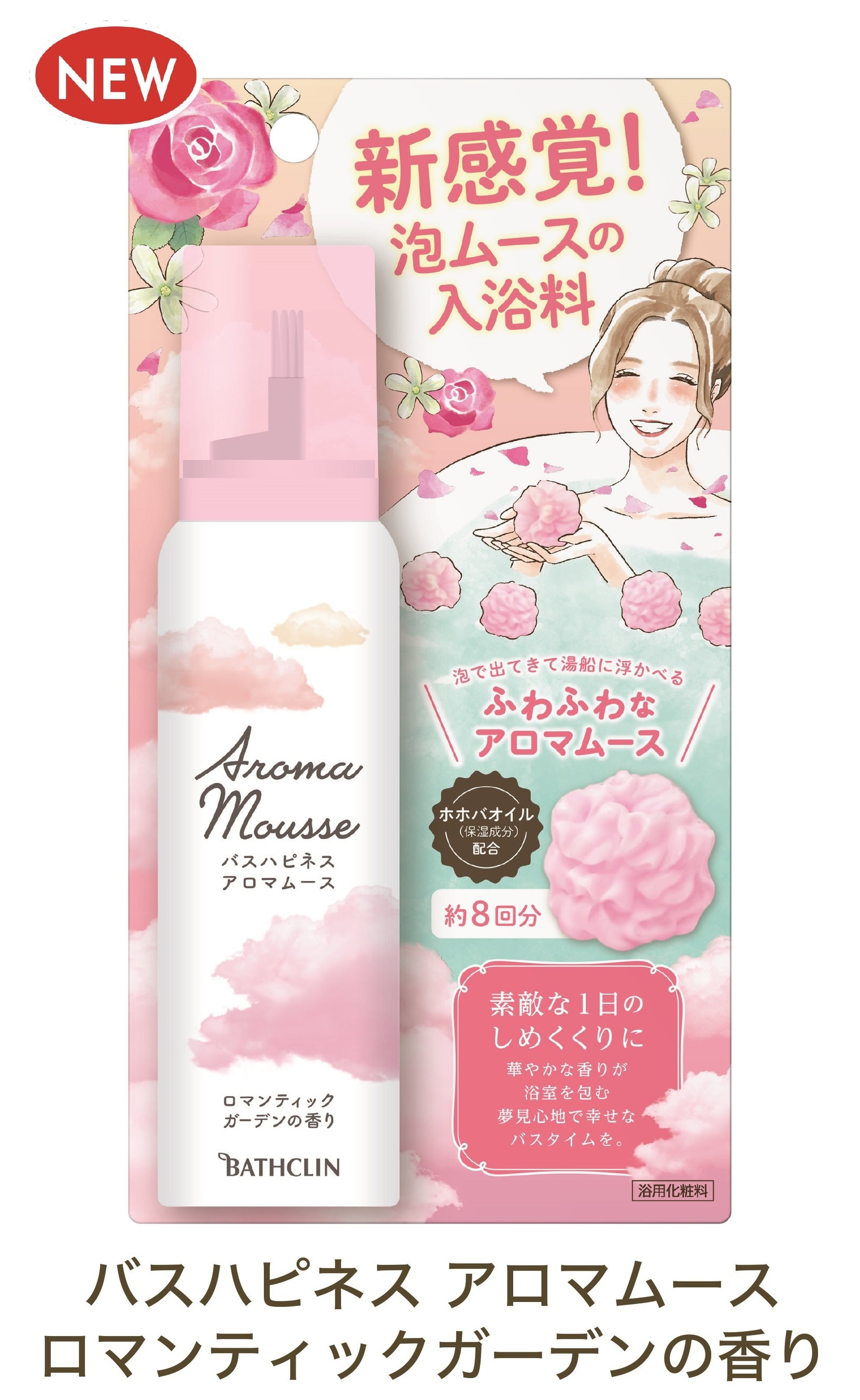 お風呂時間を楽しみたい方に向けて、泡で出てきて湯船に浮かべる新感覚の入浴料「バスハピネス アロマムース ロマンティックガーデンの香り」を10月13日(木曜日)に数量限定で発売いたします。ふわふわ泡が湯船に漂う、雲の上にいるような心地よいバスタイムをお過ごしください。