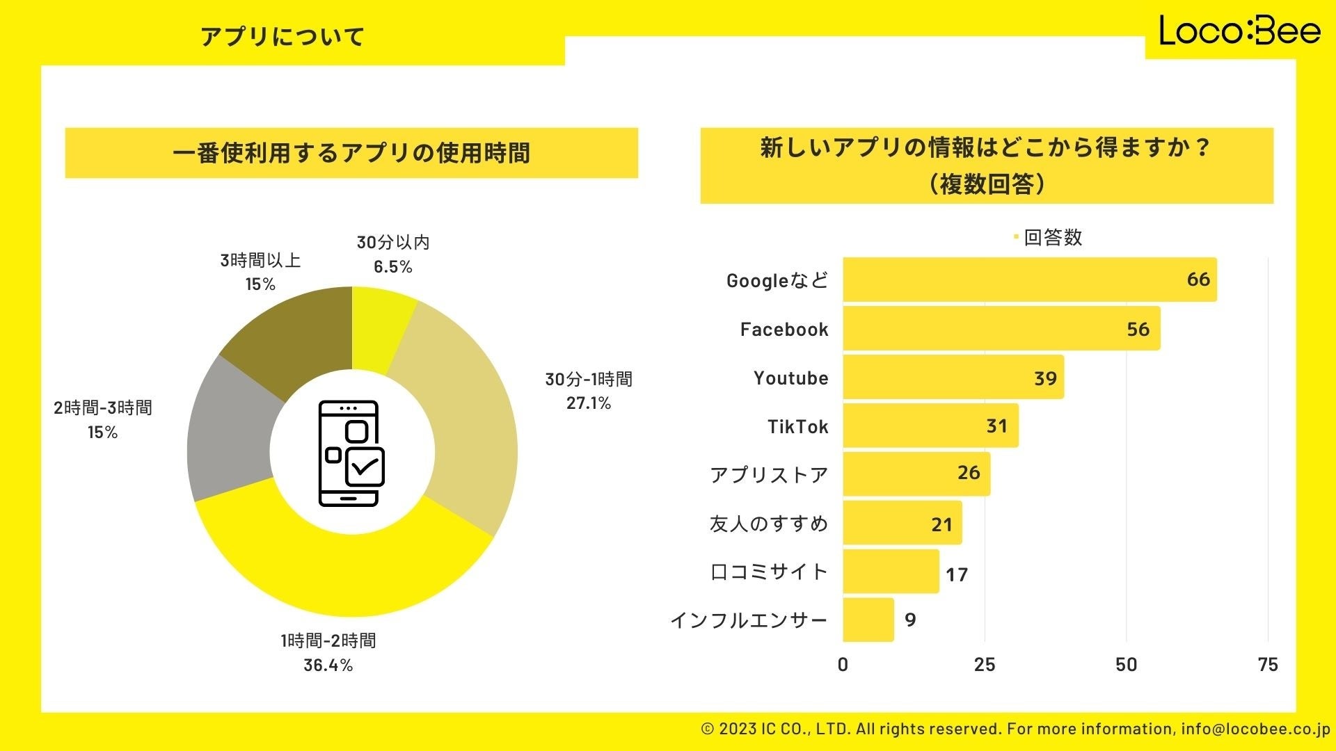 アプリの使用時間も、かなり長いことがわかります。1日のうち同じアプリを1時間以上利用している人が7割以上もいるようです。