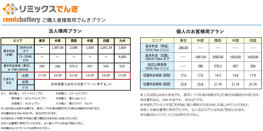 remixbatteryご購入者様専用の特別なプランを「リミックスでんき」がご提供します。シンプルでわかりやすく、地域の電力会社よりも断然お得。安価な夜間料金を設定していますので、昼間の発電量が少ない日など夜間に充電して昼間にシフト消費すると、昼間・夜間の料金差の分がお得になります。でんきプランの切り替えは簡単に行え、プラン変更による工事費用等も発生しません。電気供給の流れが変わることもないため、電気の品質も変わらず、安心してご利用いただけます。