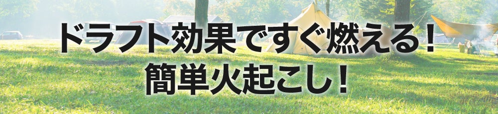 ドラフト効果(煙突効果)を利用して、少量の燃料で強い火力を生み出すことができる高い燃焼効率が特徴です。薪じゃなくても、木の枝や松ぼっくりなどの身近な材料を使って高火力が得られることから、キャンプでの使用はもちろん、非常時の備えとしても役立ちます。