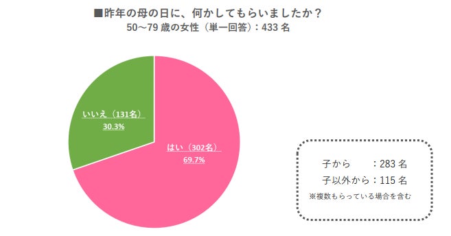 ・全体の69.7%が、母の日に何かをしてもらっている。娘がいる人(256人)のうち、母の日に何かしてもらった人は75.8%。一方、息子がいる人(296人)の場合は61.5%。娘がいる場合の方が14.3ポイント高かった。