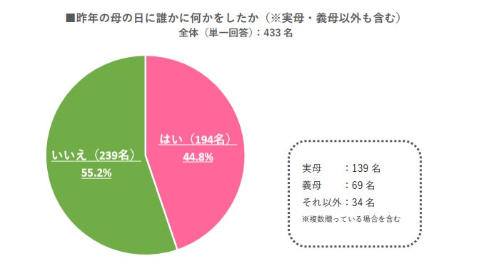・昨年の母の日に、誰かに何かをしたという人は全体の44.8%だった。