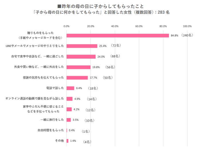 ・昨年の母の日に子からしてもらったことは、「贈りもの」がダントツ首位で全体の84.8%。その他、「LINE
