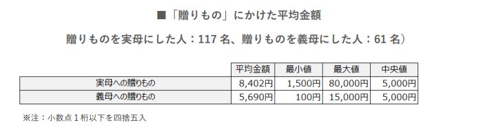 母の日の贈りものにかけた平均金額は、実母が8,402円、義母が5,690円。