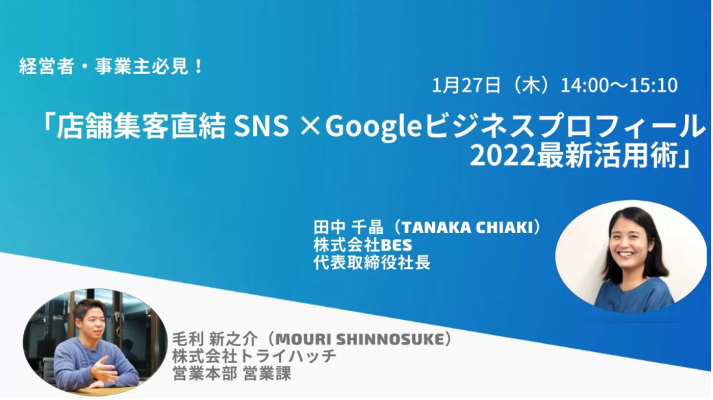 株式会社トライハッチ(所在地:東京都新宿区、代表取締役:武藤 尭行、以下「トライハッチ」)は、Webセミナー経営者・事業主必見!「店舗集客直結 SNS×Googleビジネスプロフィール 2022最新活用術」を株式会社BESとの共催にて2022年1月27日(木)14:00-15:10に開催いたします。