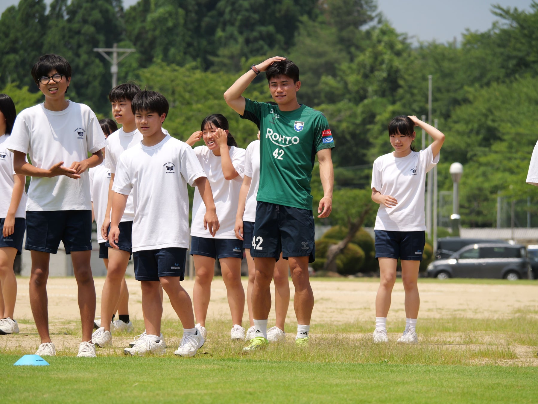 によるリフティングパス交換などのデモンストレーションから始まり、選手のシュートを体感できるGK体験や、生徒全員参加のドリブルリレー、ミニゲームと進んでいきミニゲームでは「緑中 ファイト~♪」の応援歌が流れるなど生徒の皆さんも全力で楽しんでいただけました。