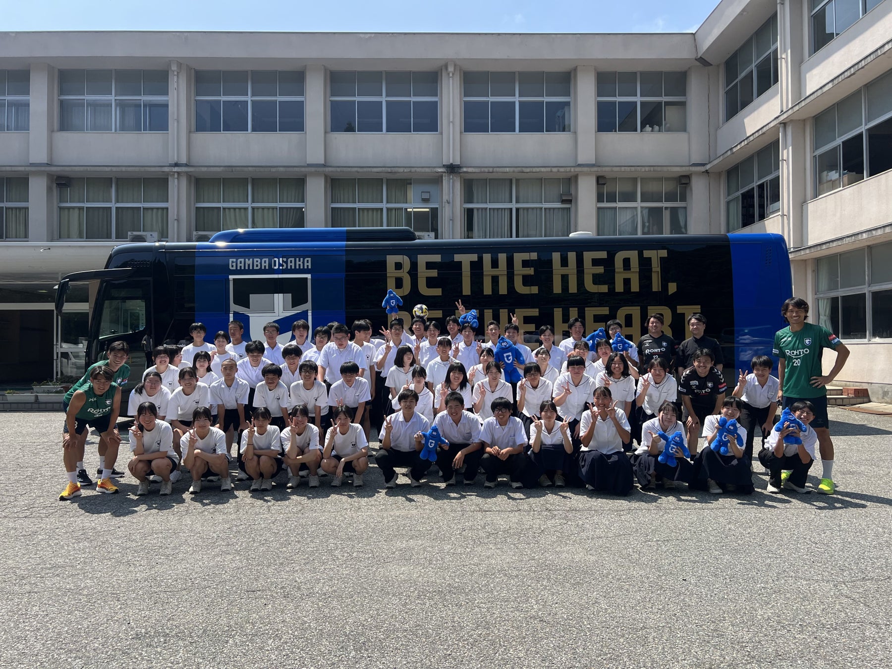 今回の訪問ではファン・サポーターの皆さまが被災地の復興を願って、私たちに託してくださった「TEAM AS ONE募金」を原資とし石川県珠洲市立緑丘中学校の約70名(2・3年生)の生徒とガンバ大阪からは中谷選手(珠洲市生まれ)、南野選手、名和田選手、阿部選手OB、ガンバ大阪アカデミーコーチの谷コーチが参加しました。