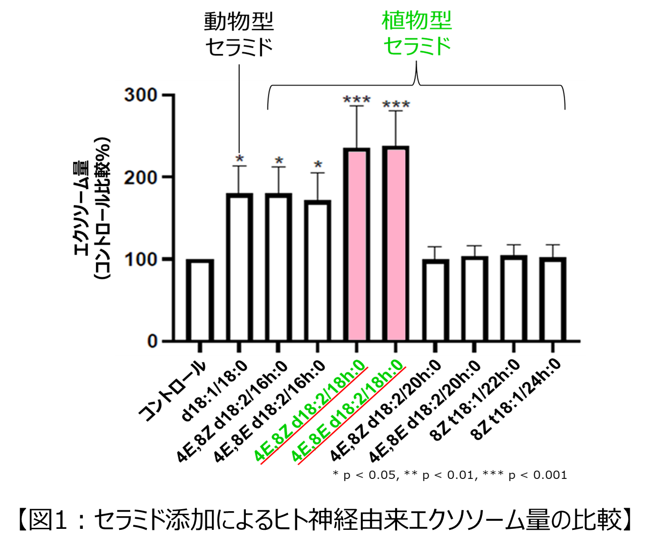 ヒト神経細胞に各セラミドを添加して24時間後に培養液上清を回収、培養液上清に含まれるエクソソーム量を測定したところ、動物型セラミドよりも植物型セラミドほうがエクソソームを多く放出し、その中でもスフィンゴイド塩基4E,8Z d18:2および4E,8E d18:2と脂肪酸の長さが炭素数18で構成された植物型セラミド(4E,8Z d18:2/18h:0と4E,8E d18:2/18h:0)が最も高いエクソソーム放出能をもつことがわかった(図1)。