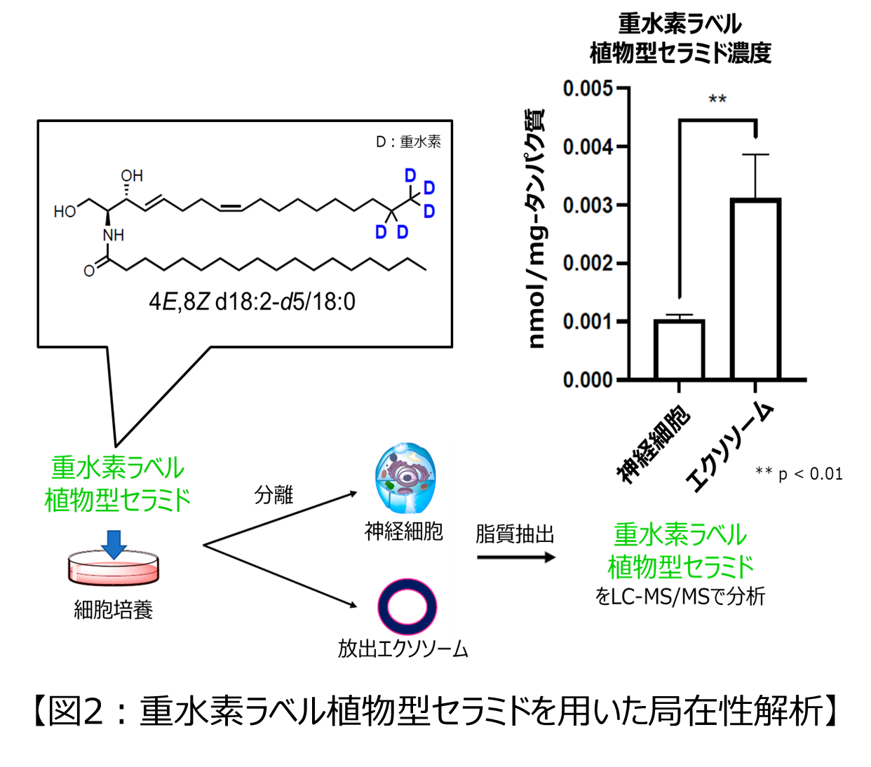 また、添加した植物型セラミドが神経細胞内に取り込まれた後、細胞内または放出エクソソームのどちらに含まれるのかを調べるため、重水素ラベルした植物型セラミド(4E,8Z d18:2-d5/18h:0)を合成し、細胞へ添加した時の局在性を調べた。重水素ラベルした植物型セラミドを神経細胞に添加し、24時間後に細胞とエクソソームを分けて回収、各々のサンプルからスフィンゴ脂質を抽出し、重水素ラベルした植物型セラミド量を測定したところ、エクソソームには細胞の約3倍量の植物型セラミドを含んでいることがわかった(図2)。