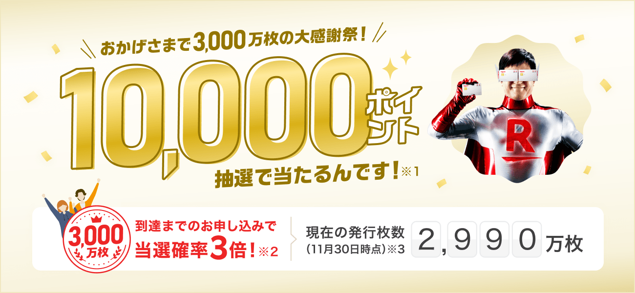 ※本日12月1日(金)からカードの発行枚数3,000万枚達成までに本カードを申し込みし、楽天カード、楽天PINKカード、楽天ゴールドカード、楽天プレミアムカード、楽天カード アカデミーが発行された場合。