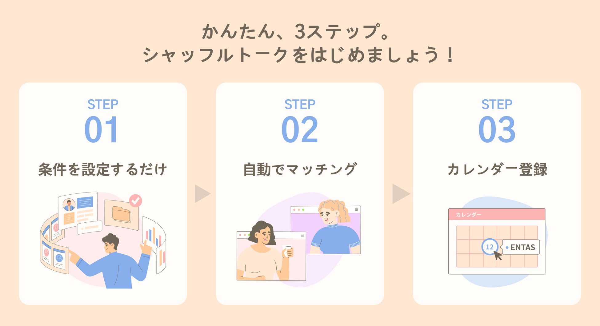 「ENTAS」では従業員情報を元に、普段は話す機会の少ないメンバー同士をマッチングさせ、カレンダーへの予定入力まで自動で行うことで、手軽に継続的に会話の場をセッティングすることが可能です。