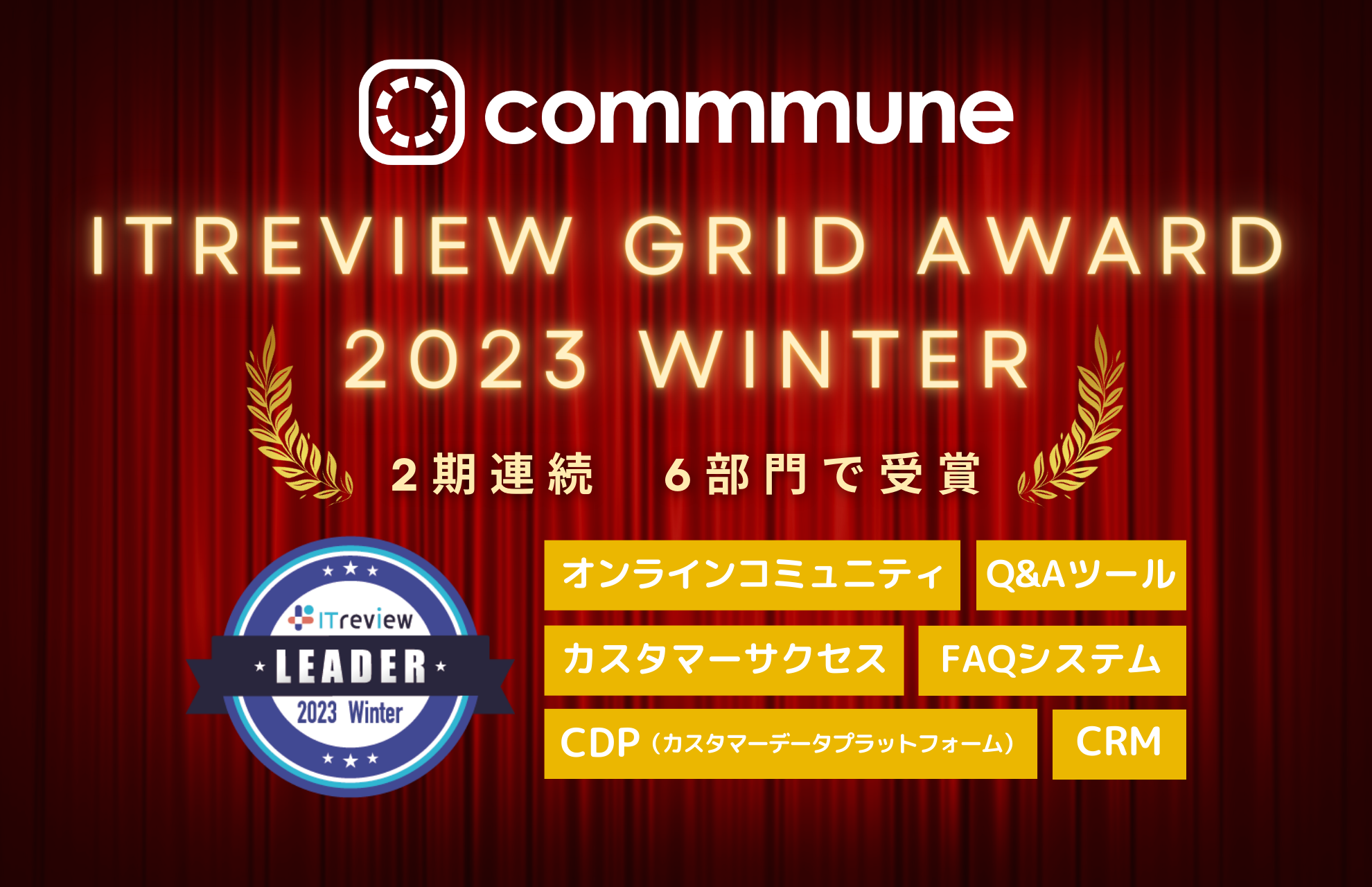 コミュニティサクセスプラットフォーム「commmune」、「ITreview Grid Award 2023 Winter」にて満足度・認知度が高い製品として最高賞のLeaderを2期連続6部門で受賞