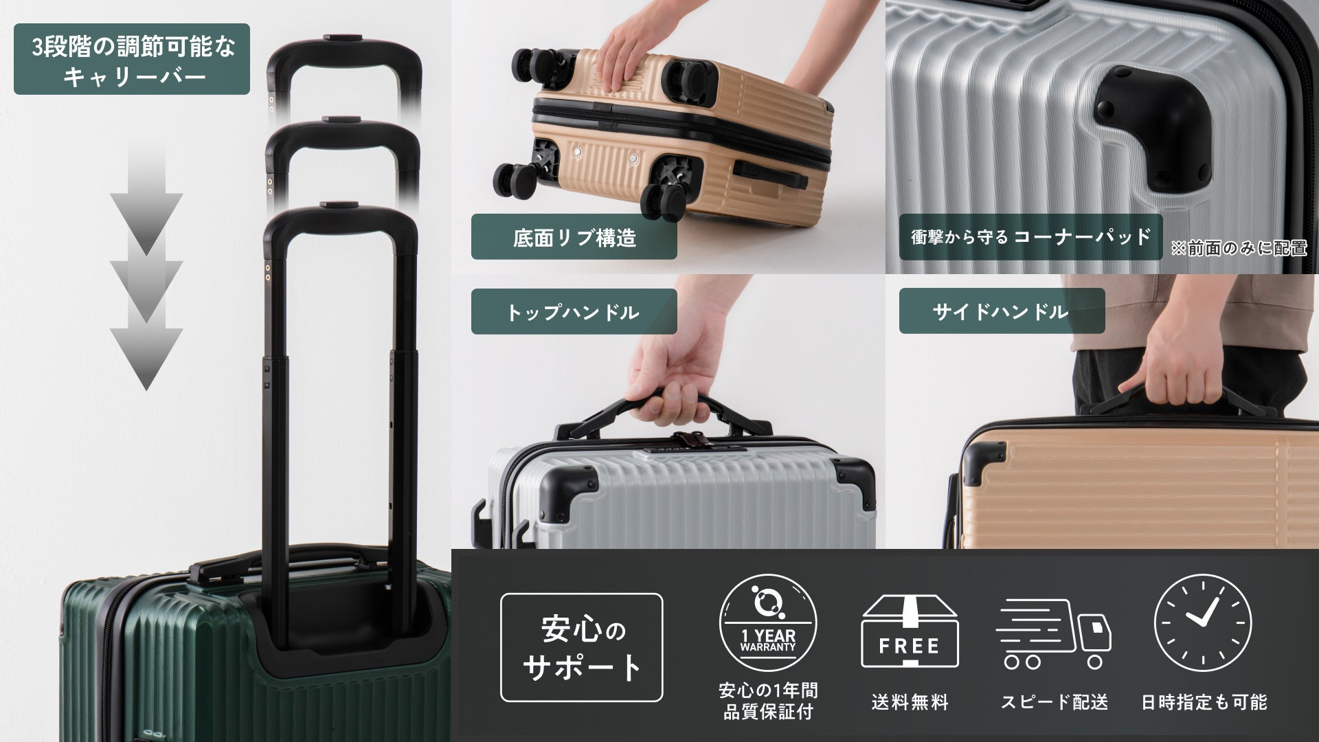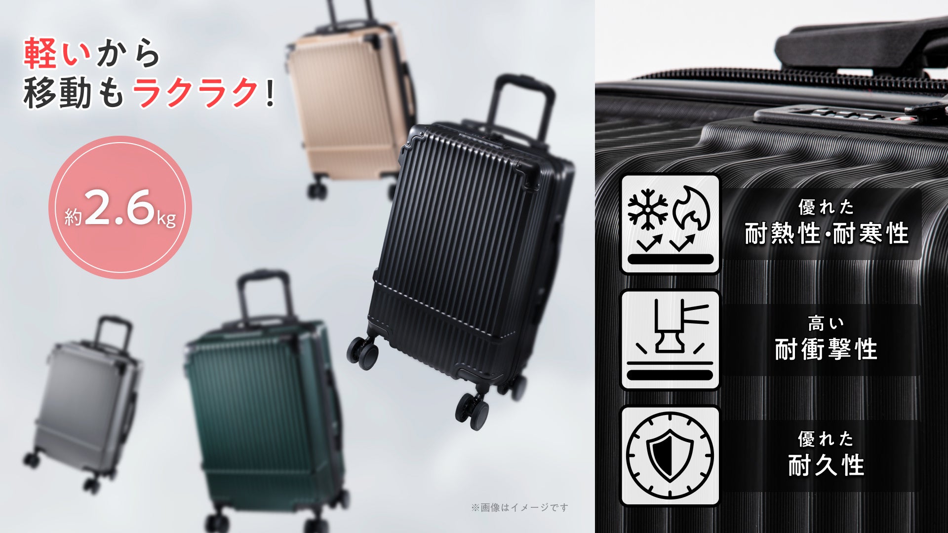 Sサイズ約2.6kgの軽量設計で機内持ち込み可能。女性も気軽に持ち運べるキャリーケースです。衝撃や熱・寒さに強く軽い素材ABSを採用し、高級感のある表面加工を施しました。2種類のリブ形状を用いることでさらに傷つきにくく耐久性UP。旅行や出張時に大切な荷物を保護します。