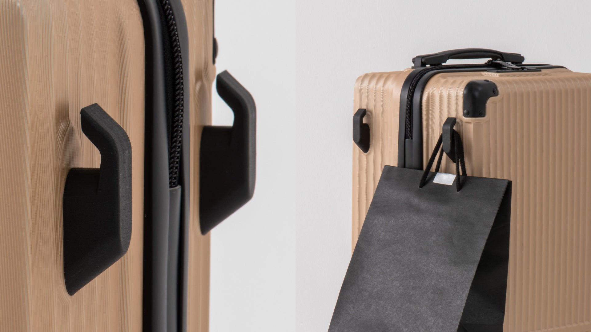 フック機能付き横足を新たに開発。スーツケースを置く際に傷や汚れから本体を守る本来の機能にプラスして、ちょっとした手荷物を引っ掛けて持ち運べるようにしました。手で荷物を持ち歩く負担が軽減され快適!