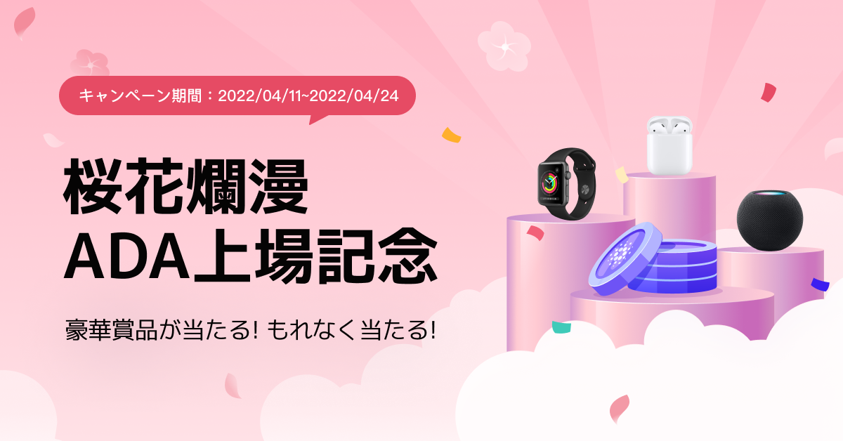 - 当社のTwitterアカウント(@HuobiJapan)をフォローし、キャンペーンの投稿をリツイートした方の中から抽選で10名に1,000円相当のADAをプレゼントいたします。