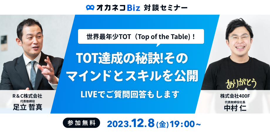 【オカネコBiz対談セミナー】TOT達成の秘訣!そのマインドとスキルを公開 世界最年少TOT R&C 足立哲真代表取締役 × 400F 中村仁代表取締役社長 対談