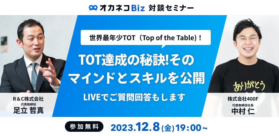 タイトル:【オカネコBiz対談セミナー】TOT達成の秘訣!そのマインドとスキルを公開世界最年少TOT R&C 足立哲真代表取締役 × 400F 中村仁代表取締役社長 対談