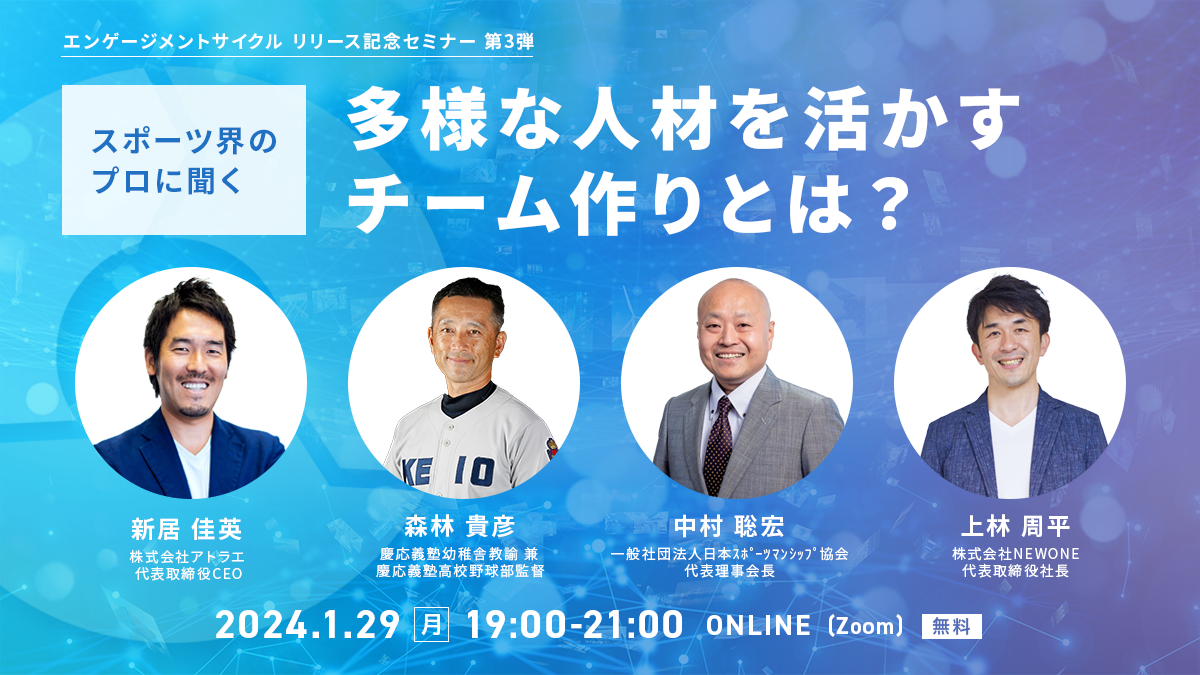 第3回では、2023年夏の甲子園で慶応義塾高校を107年ぶりの優勝に導いた森林監督をはじめ、日本スポーツマンシップ協会の中村会長、アトラエの代表取締役CEOであり、アルティーリ千葉の社長でもある新居様にお越しいただき、多様な人材を活かしたチーム作りについてパネルディスカッションを実施。スポーツでのエンゲージメント高いチーム作りと、ビジネスにおいてのチーム作りでは、どのような共通点があるのか、エンゲージメントサイクルをもとに紐解いていきます。