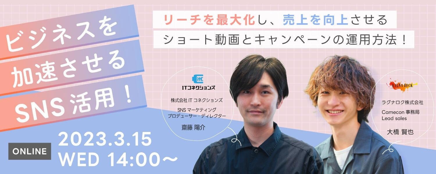 ラグナロク株式会社(本社:東京都渋谷区 代表取締役:⻄本 誠)は、2023年3月15日(水)14:00〜15:00に株式会社ITコネクションズとTikTokやInstagramの戦略的なノウハウなどを伝授する「SNS・マーケティング」担当者に向けた共催セミナーを開催いたします。