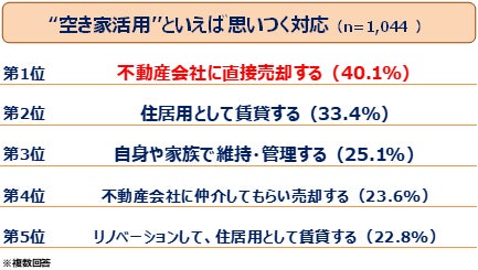 “空き家活用”と聞いて思いつく対処法としては、「不動産会社に直接売却する」が最も多く、約4割(40.1%)を占めました。次いで、「住居用として賃貸する」(33.4%)、「自身や家族で維持・管理する」(25.1%)、「不動産会社に仲介してもらい売却する」(23.6%)、「リノベーションして、住居用として賃貸する」(22.8%)と続き、多くの人が何らかの形で売買や賃貸等を想定していることがうかがえます。