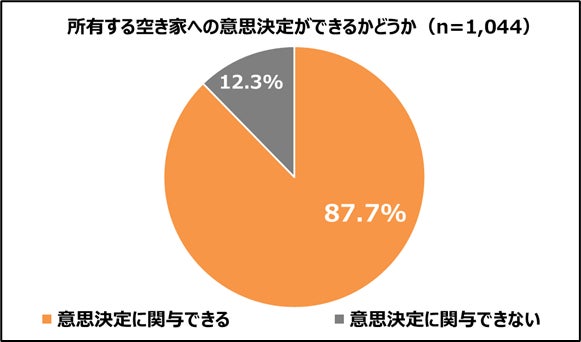 空き家を現在所有している、あるいは今後、相続予定の方に、空き家の対処についての意思決定に関与できるかを尋ねたところ、「関与できる」(「所有権を持っており、意思決定に関与できる」+「所有権を持っていないが、意思決定に関与できる」)は87.7%と、9割近い結果となりました。所有権の有無に関わらず、空き家をどうするか、その対処方法について意思決定に関与できる方が多い一方で、空き家が年々増加していることを踏まえると、なかなか実際の行動には至っていない現状がうかがえます。