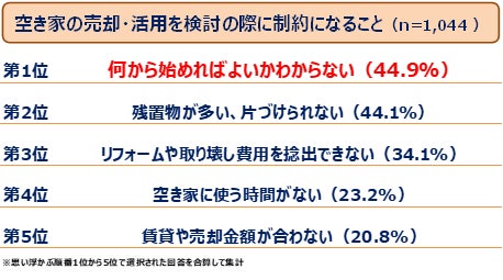 現在所有している、あるいは相続予定の空き家に対する悩みについて、「不用品の整理・撤去ができていない」が最も多く、約3割(33.1%)、続いて「売却や活用等何が一番いいのかがわからない」(29.8%)、「どのように活用すればよいか具体的なアイデアがない」(24.4%)となりました。また、空き家を売却・活用する際の制約となることについては、「何から始めればよいかわからない」(44.9%)が最も多く、次いで「残置物が多い、片付けられない」(44.1%)、「リフォ―ムや取り壊し費用を捻出できない」(34.1%)という結果になりました。いずれも不用品の処理の問題や、そもそも何をしたらよいかよいかわからない、知識がない空き家所有者が多いことがわかりました。