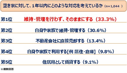 一方で、1年以内に実際に行いたい対応としては、「維持・管理を行わず、そのままにする」が最多の33.3%となり、次いで「自身や家族で維持・管理する」(30.6%)という消極的な対応が目立ちました。「不動産会社に直接売却する」は13.4%、「自身や家族で利用する[例 居住・倉庫]」は9.8%、「住居用として賃貸する」は9.1%にとどまっています(複数回答)。