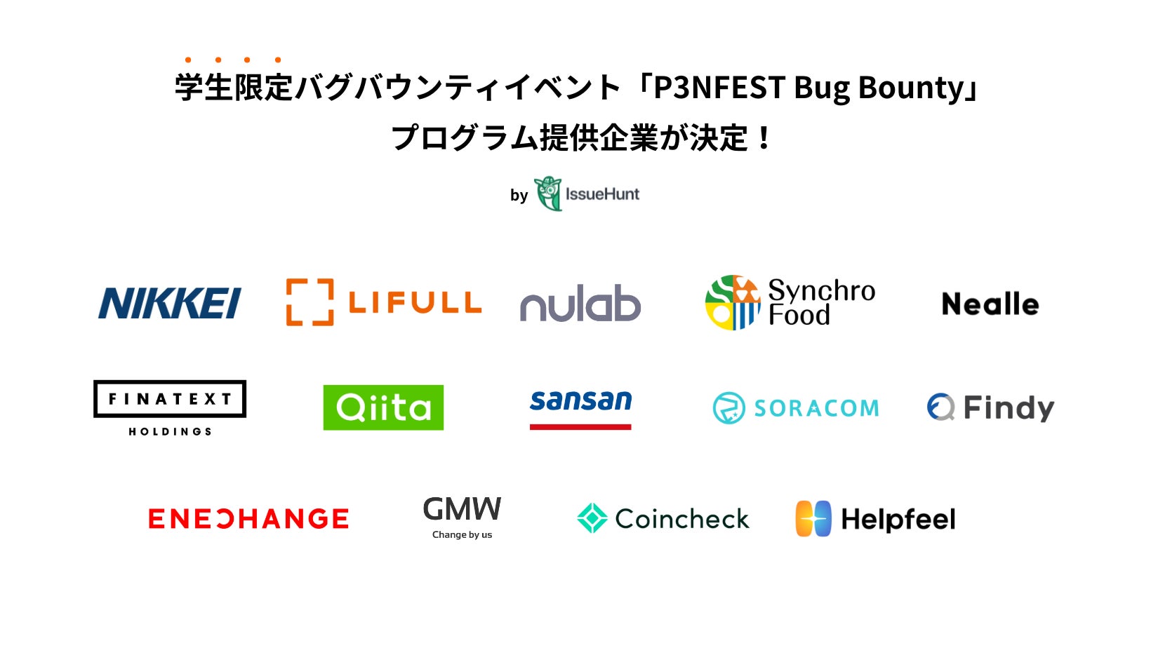 IssueHunt株式会社主催、学生向けバグバウンティイベント「P3NFEST BugBounty」、バグバウンティプログラム提供企業が決定!
