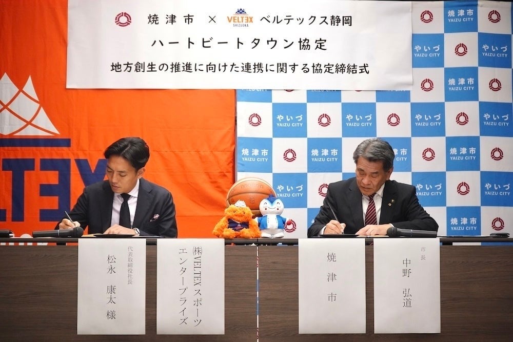 このたび、ベルテックス静岡は、焼津市と地方創生の推進のため、人的・物的・知的資源を効果的に活用することにより、活力あるまちの創出と持続可能な地域の発展に資することを目的とした「ハートビートタウン協定」を締結し、11月20日(水)に、焼津市役所において締結式を執り行いましたのでお知らせいたします。