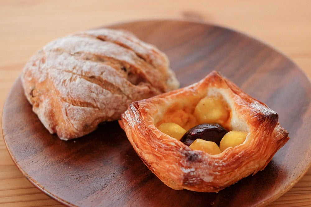 栗と紅茶のハードパン(写真右奥)は、栗のペーストと渋皮栗の2種類が入った紅茶香るハードパン。 手に持った瞬間から紅茶の良い香りがします。 1口食べてみるとパリッとした生地と栗ペーストの甘さ、渋皮栗の食感と甘みを感じます。紅茶がふわっと香り、ティータイムに食べたくなる1品です。