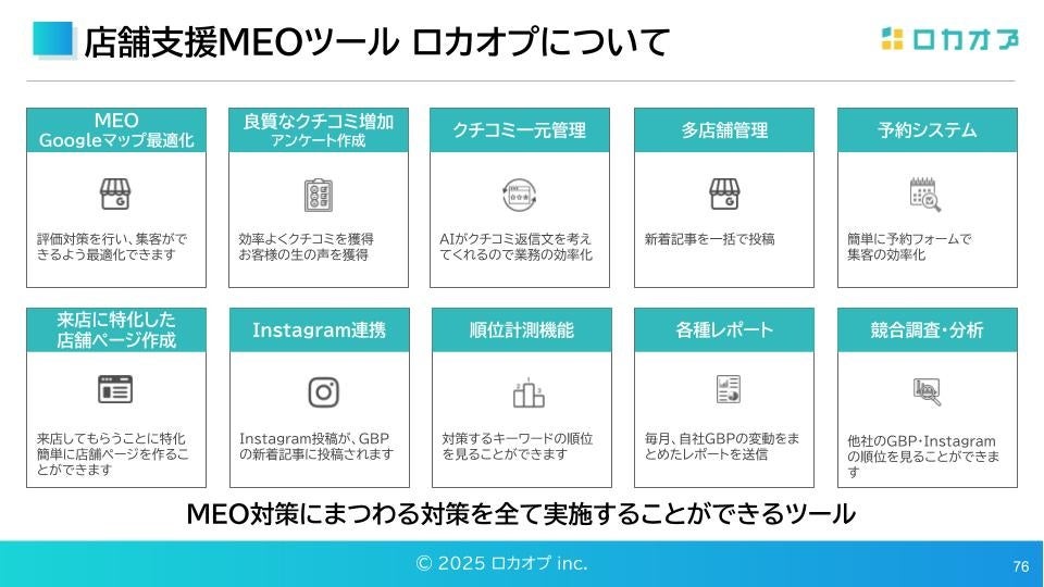 最後に、日々の店舗運営の中でGoogleマップやSNSを継続的に活用していくための手段として、ロカオプが提供する各種支援ツールについても紹介されました。