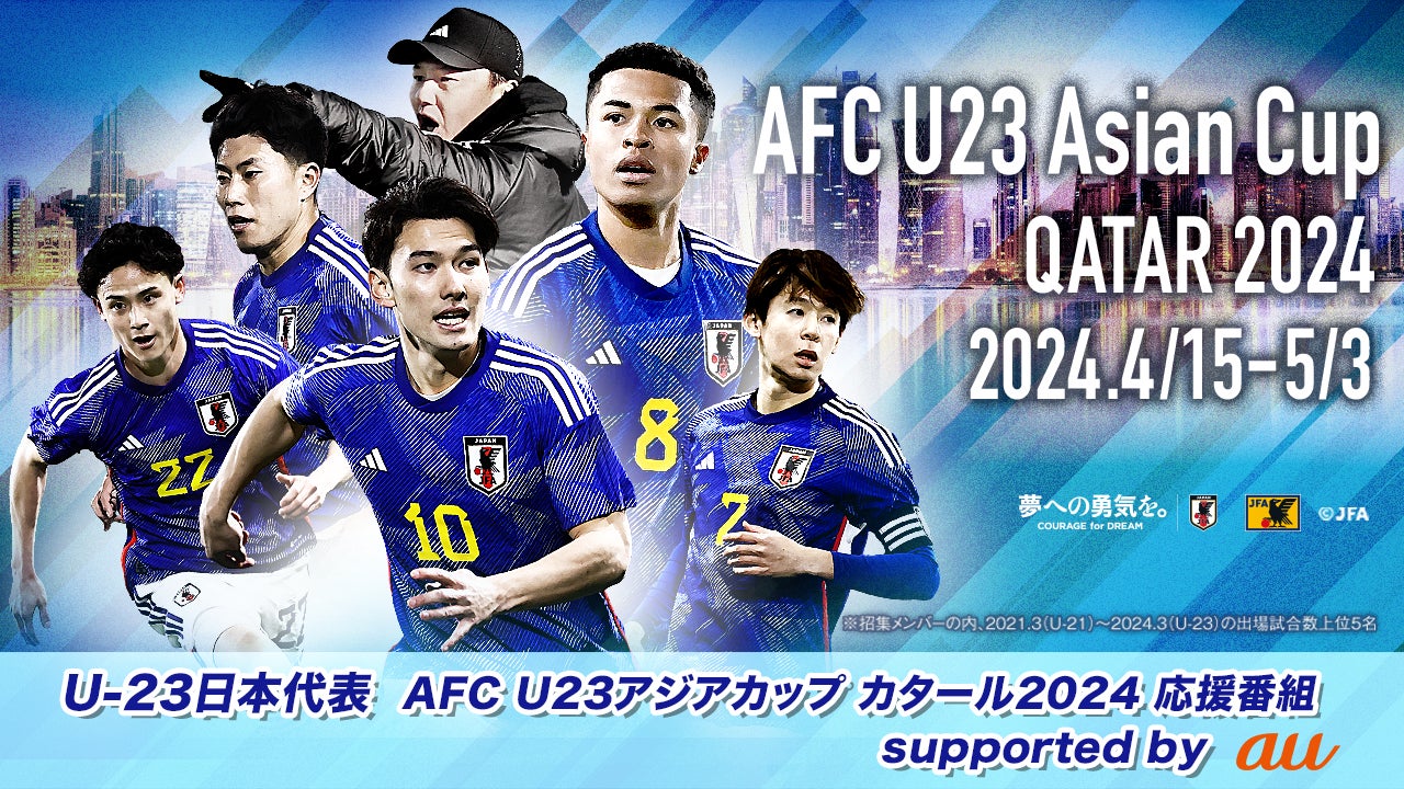 公益財団法人日本サッカー協会(JFA)は、JFAメジャーパートナーであるKDDI株式会社(KDDI)と共同で、カタールで行われるAFC U23アジアカップの第2戦U-23日本代表対U-23UAE代表戦※にむけてエールを送るべく、4月19日(金)19:00からJFAサッカー文化創造拠点 blue-ing!にて、「U-23日本代表 AFC U23アジアカップ カタール2024 応援番組 supported by au」を生配信します。